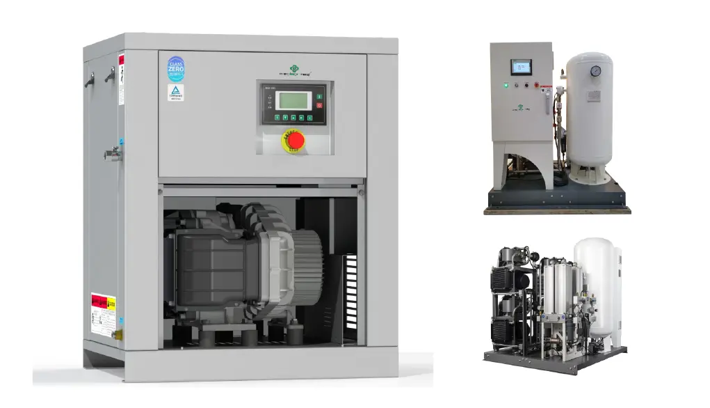 میڈیکل ایپلی کیشنز کے لئے عام طور پر استعمال ہونے والی ایئر کمپریشن میں تیل سے پاک اسکرول کمپریسرز ، مائکرو آئل یا آئل فری سکرو ایئر کمپریسرز ، مائکرو آئل یا آئل فری پسٹن کمپریسرز ، وغیرہ ہیں۔ ایئر کمپریسر کے علاوہ ، اس نظام میں عام طور پر کولر ، ڈرائر ، فلٹرز ، ٹینک اور نگرانی کے سامان جیسے اوس پوائنٹ مانیٹرنگ اور سی او مانیٹرنگ ہوتی ہے۔
